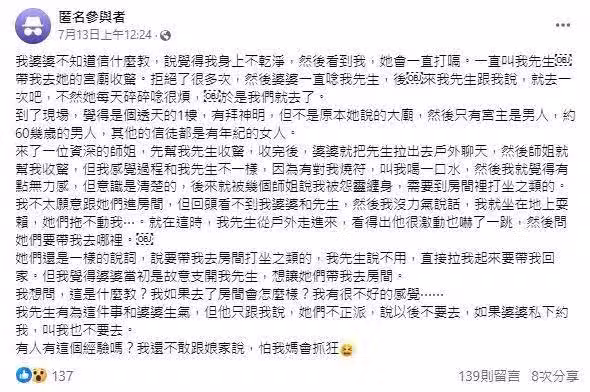 婆婆說我「身上不幹凈」,帶我和先生去宮廟收驚,幾個師姐燒符、叫我喝水,我突然覺得全身無力,她們說「你被怨靈纏身!」就把我拖進小房間...