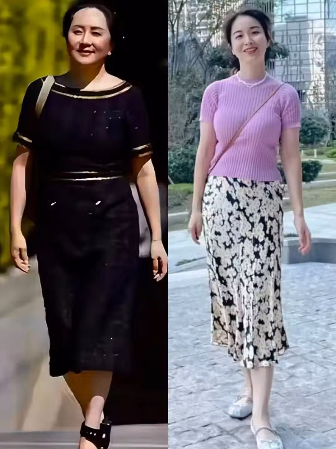 兩位女士同樣都是明媚的笑容,可左邊這位女士整體上單調乏味,右邊女士在亮色系襯托下更有氣質明艷大方。