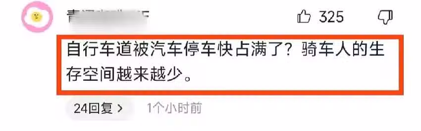 該照片傳出後,網友議論紛紛: 有網友抱怨,現在車太多了,自行車車道都被機動車輛搶占了。