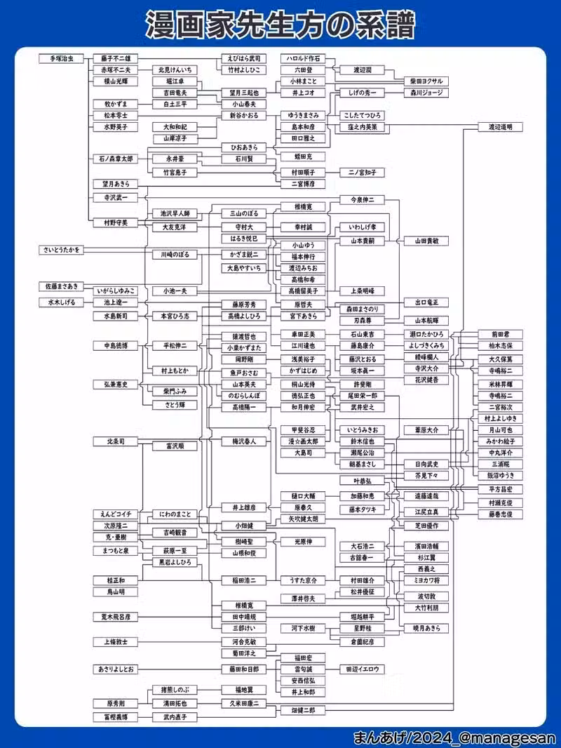 雖然就如同「まんあげ」所說,圖中的人際關係並不一定全都是「師徒」,也有可能只是去人家身邊當個幾天「助手」罷了。不過能夠知道這些漫畫家之間有著交流、聯繫與傳承,還是讓日本網友們直呼出乎意料啊!