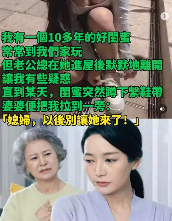 我有一個10多年的好閨蜜,常常到我們家玩,但老公總在她進屋後默默地離開…讓我有些疑惑。直到某天,閨蜜突然「蹲下繫鞋帶」,婆婆便把我拉到一旁:「媳婦,以後別讓她來了!」