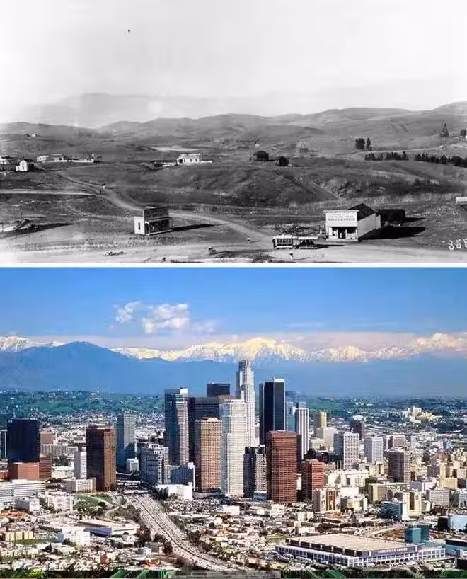 7.1850年的洛杉磯與2001年的洛杉磯對比,當時洛杉磯才剛設市,人口才1000多人,居民的房屋稀疏散落在山上,而如今洛杉磯成了美國第二大城市,擁有400多萬居民。