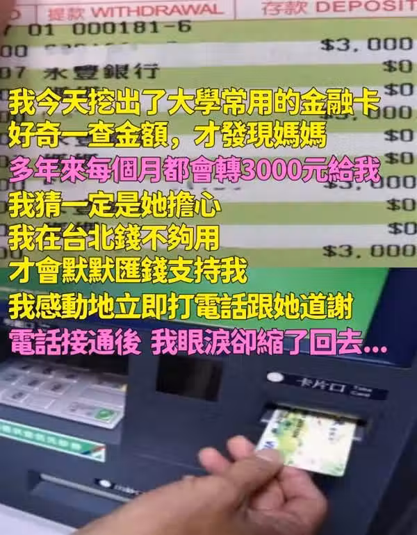 我今天挖出了大學常用的金融卡,好奇一查金額,才發現媽媽多年來每個月都會轉3000元給我,我猜一定是她擔心我在台北錢不夠用,才會默默匯錢支持我。我感動地立即打電話跟她道謝,電話接通後我眼淚卻縮了回去...