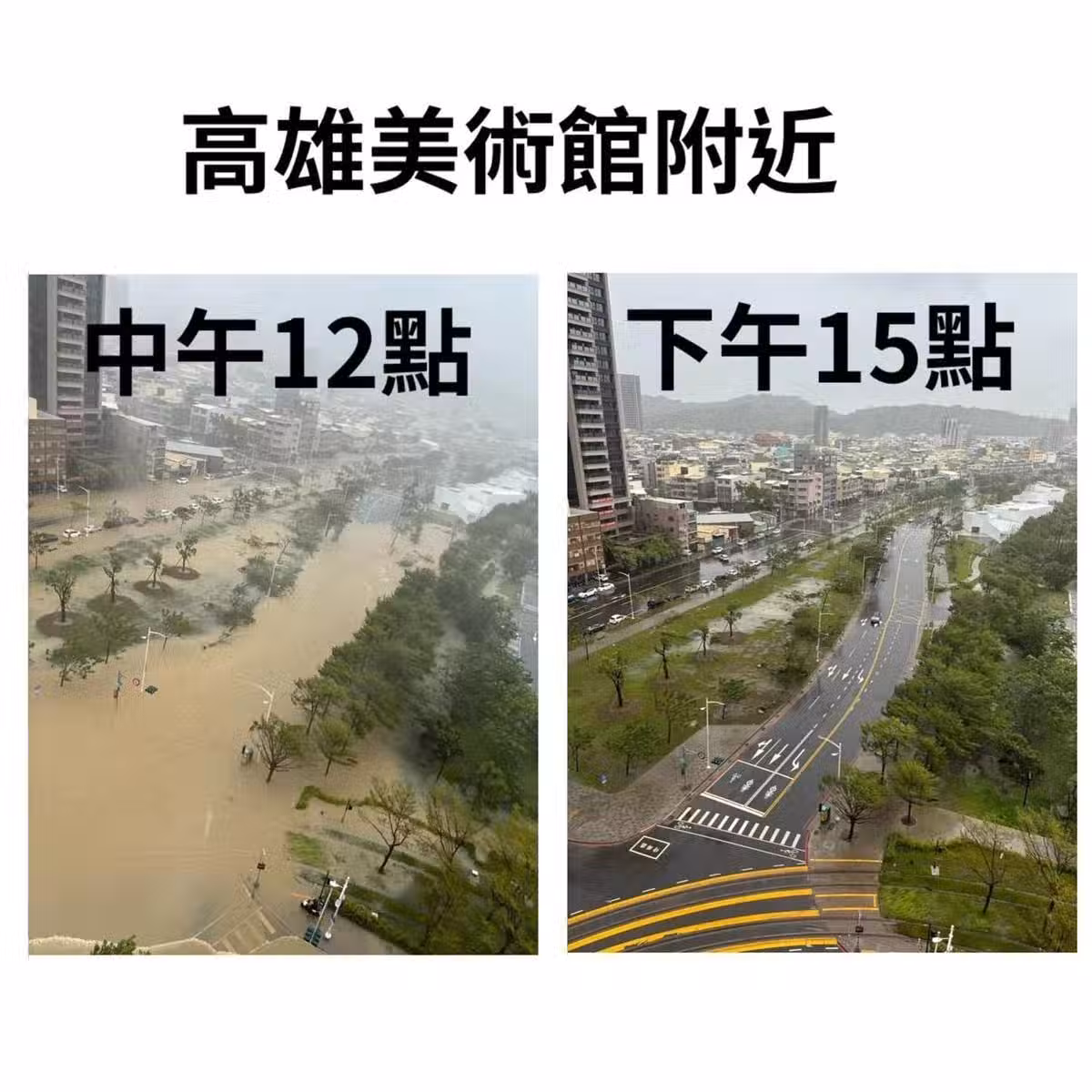 不過,網絡粉專「貓與邪佞的手指」統整出熱心社友提供的高雄各地區照片比較,可見多處區域的積水其實在很快的時間內已陸續退去,不少網友見狀也直呼「這樣的消退速度真的很快了」、「謝謝辛苦的工作人員」。