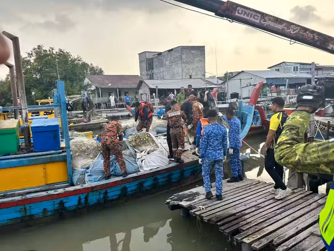 搜救隊伍將死者遺體送往碼頭,並交由警方採取下一步行動。(圖取自峇眼拿督警區面子書)