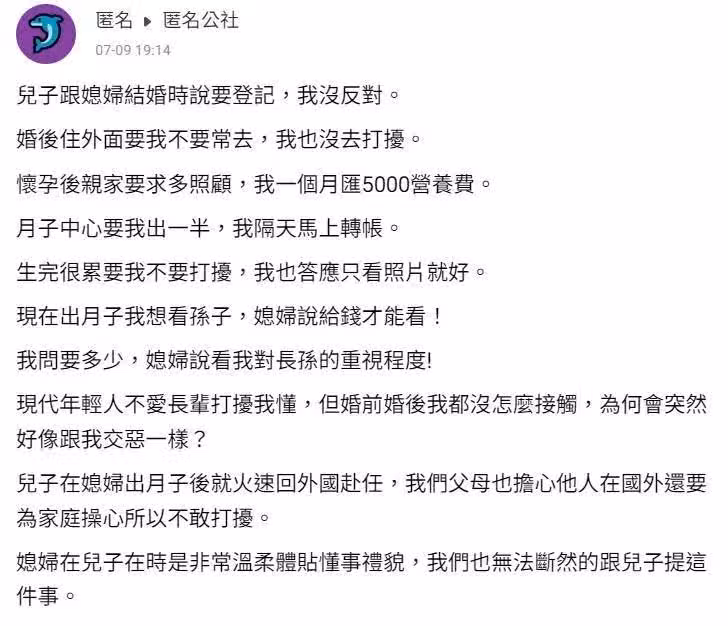 我自認是好婆婆,媳婦懷孕後,我每月給她「5千營養費」、還補貼月子中心一半費用,現在媳婦出了月子,竟要求「給錢才能看孫」!媳婦看我沒要匯錢的意思,直接打來說了一句...