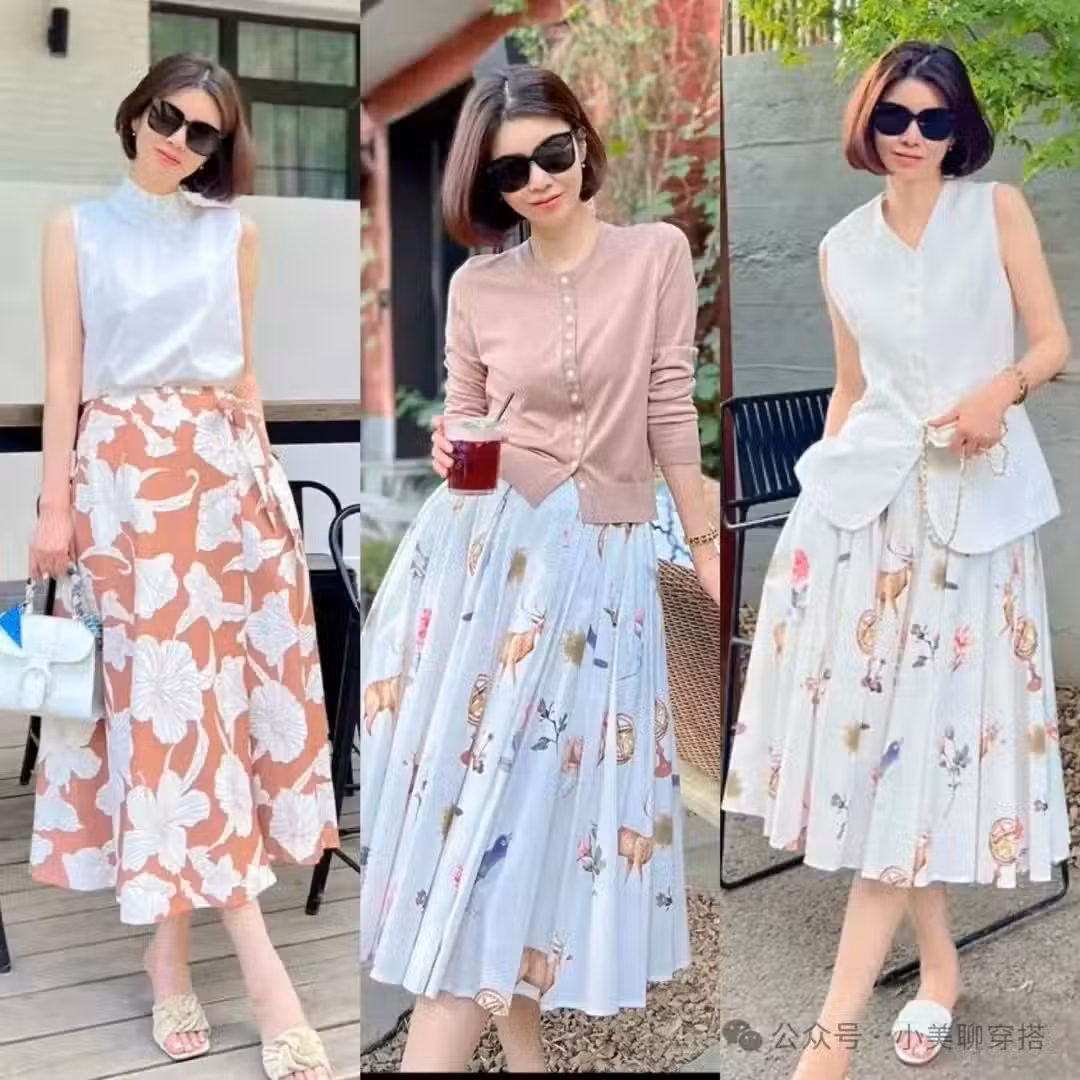 夏天總是需要一些浪漫的氛圍,熟齡女生特別適合穿印花赫本裙,感覺美得特別精緻溫婉。白色的無袖襯衫,有一些法式的設計感,選擇了粉色印花赫本裙,是很低調的皮粉色,整套的搭配清新典雅,又帶著高級感,而且特別浪漫,適合正式的場合。