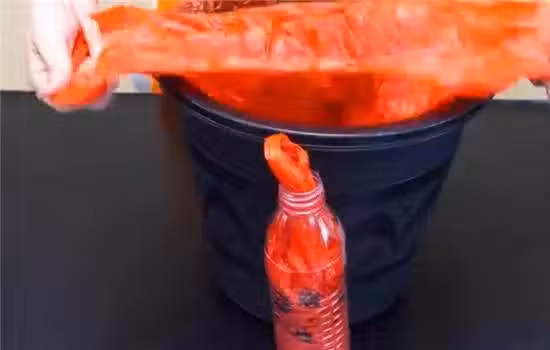 兩個寶特瓶蓋都割好後,再使用熱熔膠,將兩個分別粘在垃圾桶的兩邊。粘的時候沒有割掉的瓶周圍朝上,而且一定要對稱。瓶蓋粘牢固後,再將寶特瓶粘在垃圾桶上。接下來看一下這樣有什麼妙用吧。