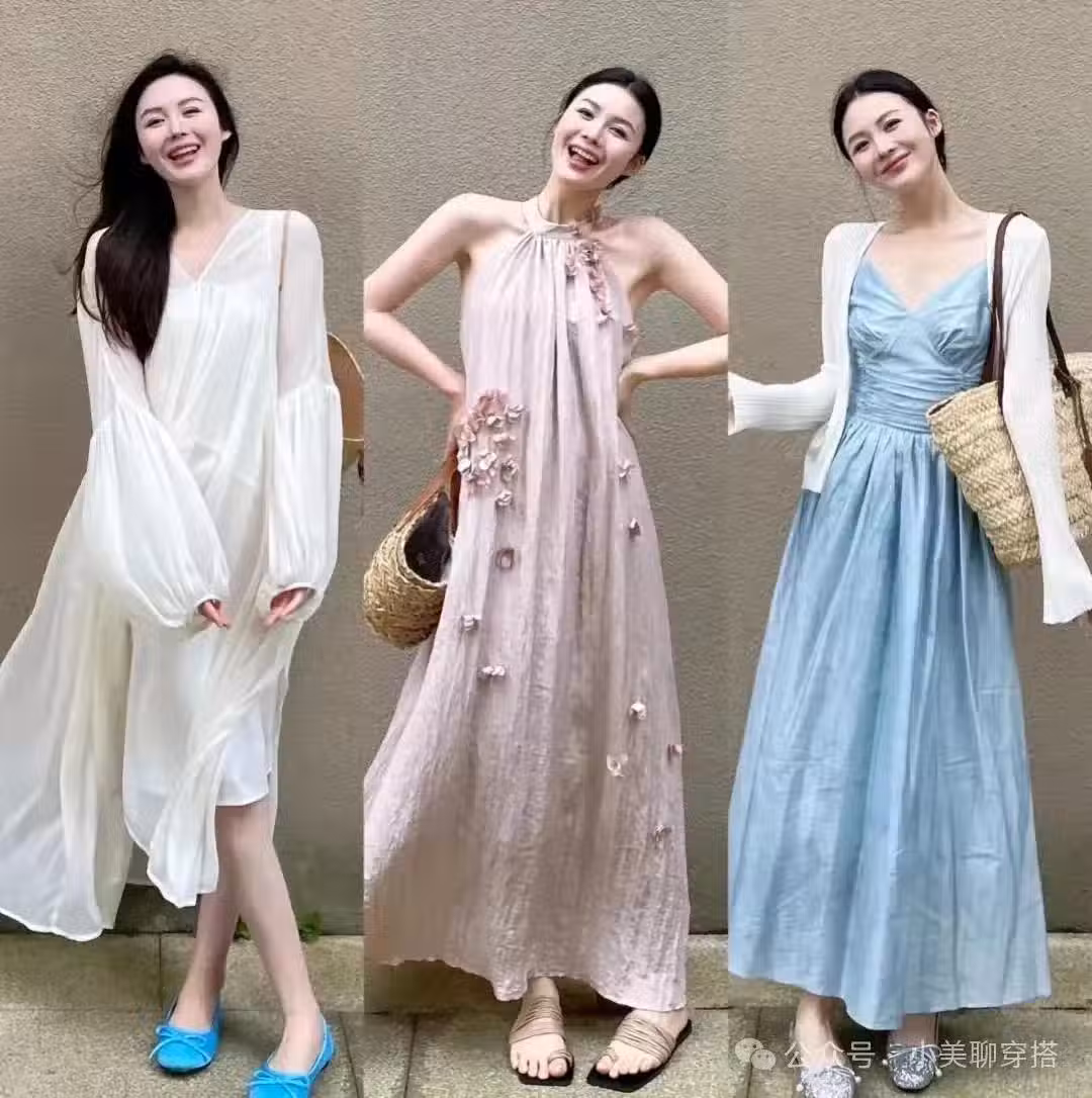 沙灘長裙一定要選擇輕盈又有垂感的面料,比如雪紡、苧麻、真絲,輕盈又輕薄,選擇淡雅的淺色系,比如白色、櫻花粉、水藍色等,更清新浪漫。