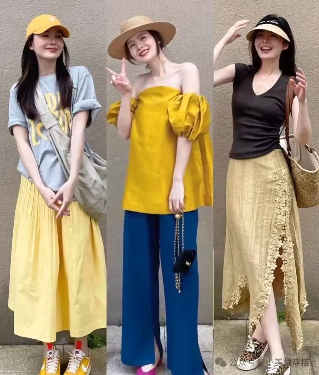 我們在選擇黃色時,膚色偏暗的女生可以選擇露膚多一些的黃色單品,會更顯白。