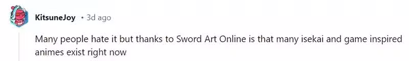 「我覺得不論有沒有《刀劍神域》,異世界風潮始終都會到來。在《刀劍神域》動畫開播之前,網絡小說就已經逐漸侵蝕輕小說業界了。或許《刀劍神域》加速了異世界的流行,但是即便沒有《刀劍神域》,異世界熱潮到來也只是遲早的問題。」