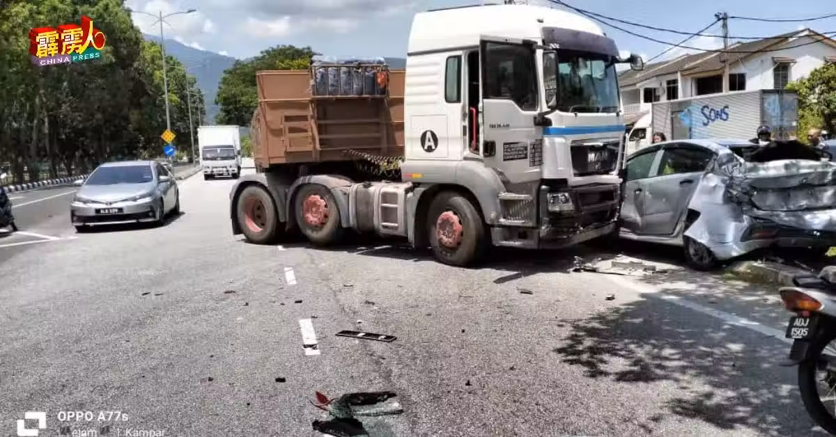 這起意外是昨午3時許,在金寶新街場峇都西那路三叉路口處發生。突然停在路中的轎車,遭尾隨剎車不及的拖格羅厘撞上後,該轎車接著連撞在三叉路口等待通行的另3輛轎車。