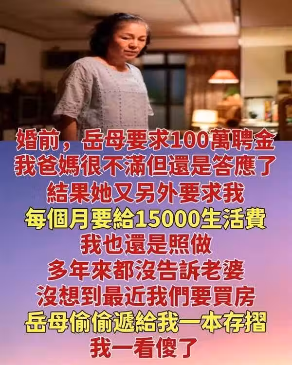 婚前,岳母要求100萬聘金,我爸媽很不滿但還是答應了! 結果她又另外要求我「每個月要給15000生活費」我也還是照做,多年來都沒告訴老婆...沒想到最近我們要買房「岳母偷偷遞給我一本存摺!」我一看傻了😲