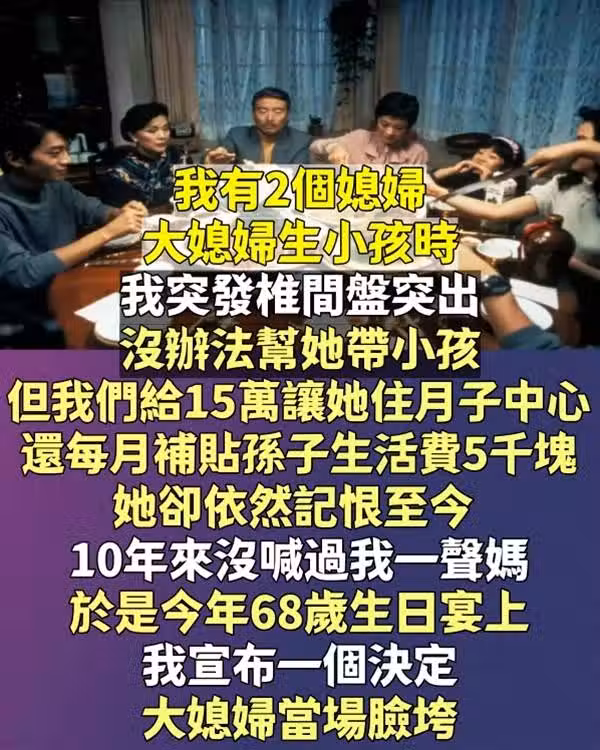 我有2個媳婦,大媳婦生小孩時「我突發椎間盤突出」沒辦法幫她帶小孩...但我們給15萬讓她住月子中心、還每月補貼孫子生活費5千塊,她卻依然記恨至今「10年來沒喊過我一聲媽」! 於是今年68歲生日宴上「我宣布一個決定」大媳婦當場臉垮🤭