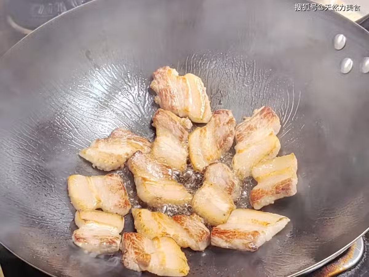3、鍋內只留10克剛才煎五花肉留下來的豬油,往鍋內加入20克冰糖我們來炒一個糖色,炒糖色全程小火,不能心急,在炒糖色的整個過程都要不停的攪拌。冰糖融化後是白色的糖漿,接著會慢慢變成啤酒的顏色,再慢慢地變成香油的顏色,再慢慢地變成棗紅色並且冒大泡泡。