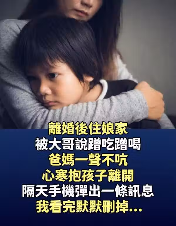 失婚後住娘家!被大哥說「蹭吃蹭喝」爸媽一聲不吭😭 心寒抱孩子離開「隔天手機彈出一條訊息!」我看完默默刪掉...