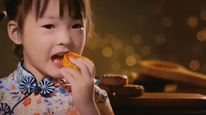 女兒歪在一邊,看到她奶奶拿來的月餅,伸手拿了一個,吃了一口。
