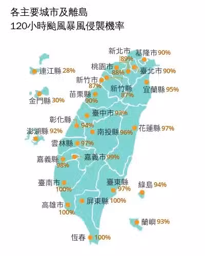 至於大眾關心的颱風假,中央氣象署公布各主要城市及離島「120小時颱風暴風侵襲機率」,當中有4縣市高達100%,包括:台南市、高雄市、屏東縣、恆春。另外嘉義市99%、嘉義縣98%,雲林縣、台東縣、花蓮縣97%,南投縣96%,宜蘭縣95%,彰化縣與綠島94%,台中市與蘭嶼93%,澎湖縣92%;苗栗縣、基隆市、台北市也有90%,新北市則為89%。