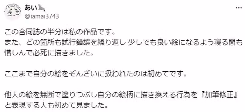 「我現在已經跟她毫無交流,她也封鎖了我的帳號。因此我才完全不知道之前那本合作同人誌被她重新公開,以及我的作品遭到重畫的事情,我從頭到尾都沒有允許。身為畫畫的人,真的難以置信,也不想相信會有這種事情發生。」