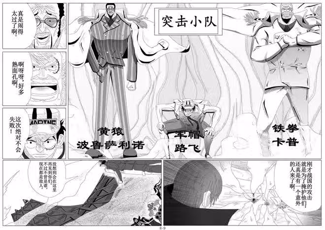 啊啊!突擊小隊居然是以軍帽路飛為首的隊伍,有海軍英雄卡普,大將黃猿。戰國的攻擊取得圓滿成功,雖然不能突破屏障堡壘,但也成功吸引到四皇的注意,讓軍帽路飛等人可以順利進入中心戰場。