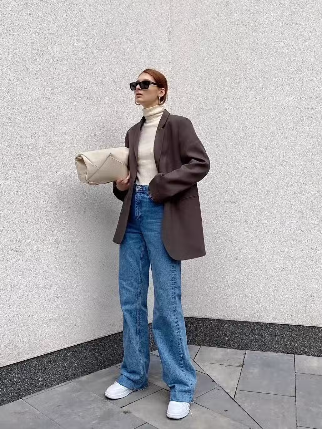 若是自己所在的地區偏冷,不適合露出腳踝,我們也可以像上圖一樣,選擇一條高腰闊腿褲或者是直筒褲,通過把上裝的衣角塞進褲腰裡面,最大限度的拉高腰線位置,讓觀賞者的視線從稍顯拖沓的褲腳向著纖細的腰肢轉移,這樣既彰顯出三七分的優越比例,還能襯托出女性那股漫不經心的隨性與慵懶風情。