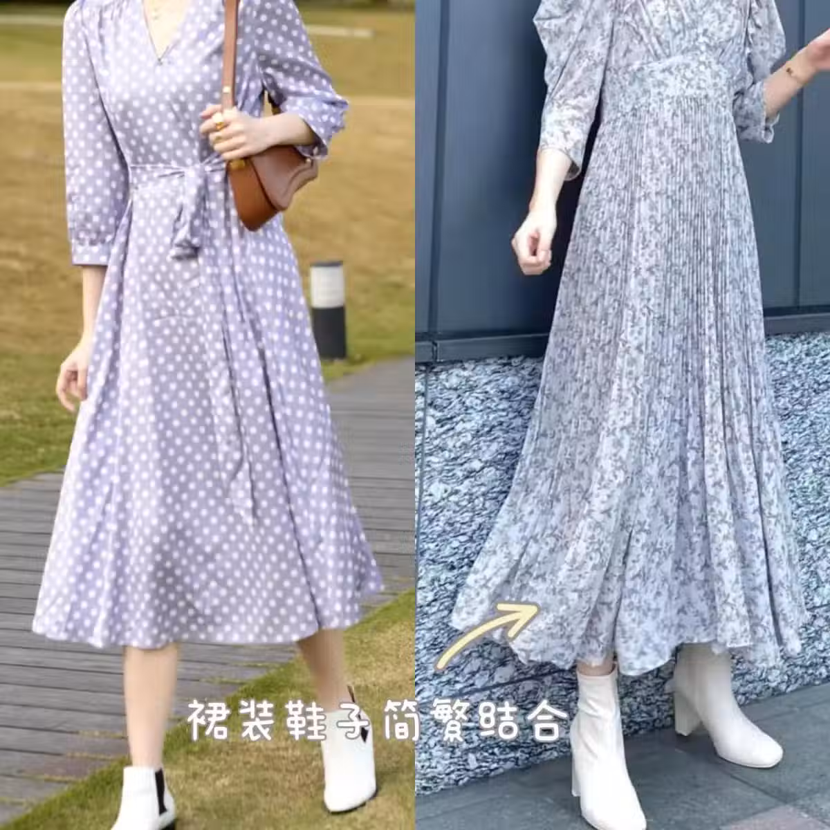 而且在具體搭配時,大家也可以根據你的穿搭風格來進行對比,讓造型融入多種風格,相互平衡, 比如這種溫柔的碎花裙看上去確實比較成熟,浪漫,配上個性的長筒靴,還能夠增強酷酷的氣質,這種甜酷風比單一的甜美風更洋氣。