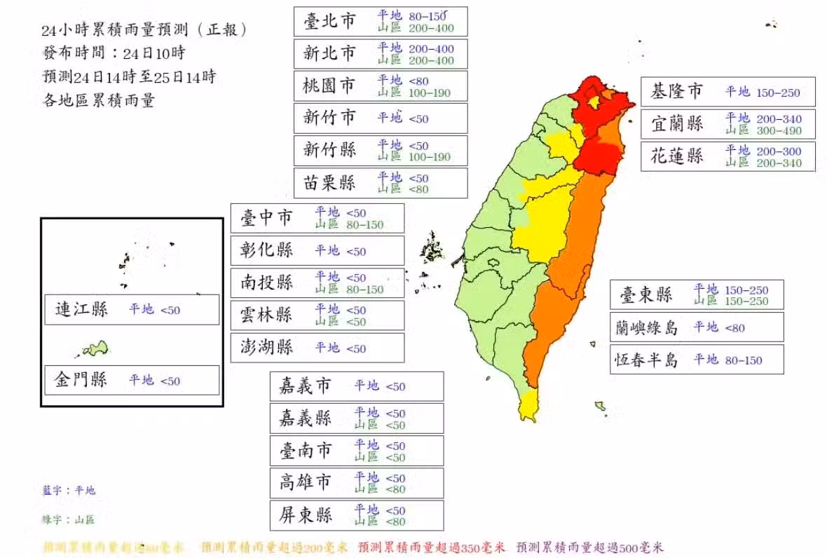 根據氣象署的24小時累積雨量預測,台北市山區200至400毫米、新北市平地和山區200至400毫米、宜蘭縣山區300至490毫米,以及台東縣山區150至250毫米,達颱風假標準。