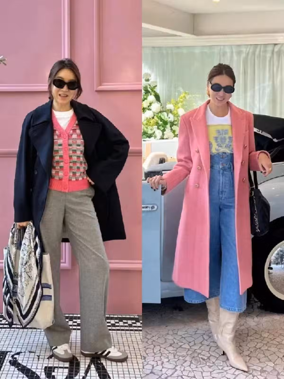 看看這位韓國博主,年紀大了也穿淺粉色,選擇淺粉色針織奶奶衫配深色大衣,穿淺粉色呢大衣配藍色牛仔褲,時髦減齡。