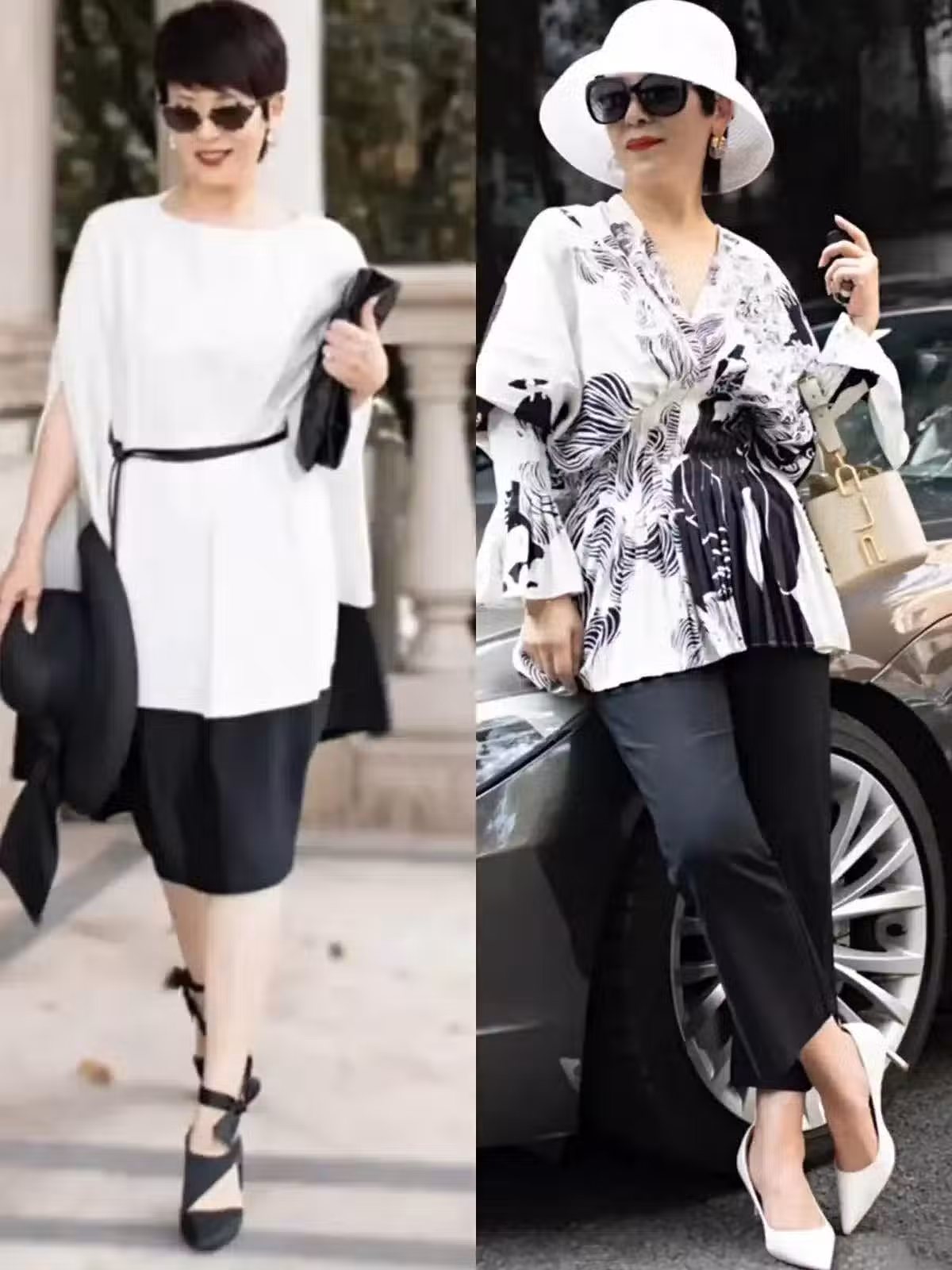 比如我們可以採用上白下黑的搭法,在此基礎上,通過色彩呼應、增加印花圖案、搭配配飾等方式,扭轉乾坤。