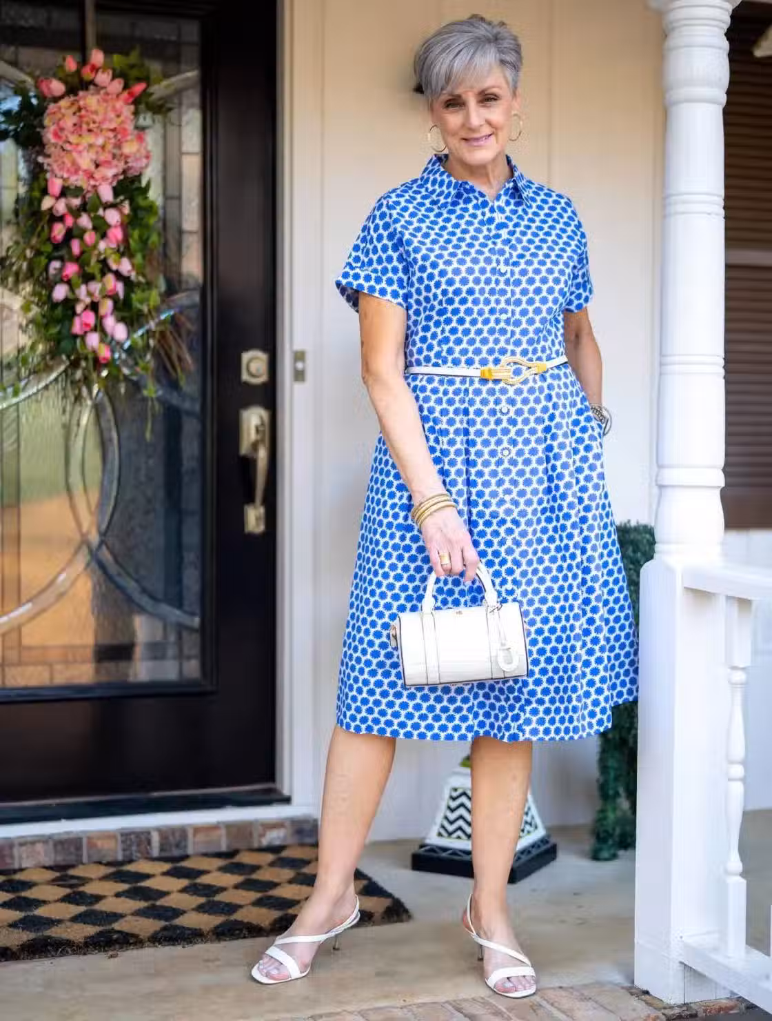 如果想要利用腰帶的來打造腰線,對於身形圓潤有小肚子的女性, 選擇一條細腰帶會是比較好的選擇。比如說這一身藍白色襯衫裙,搭配一條白色細腰帶,整體上就比較簡潔,也不會因為寬腰帶而顯胖。