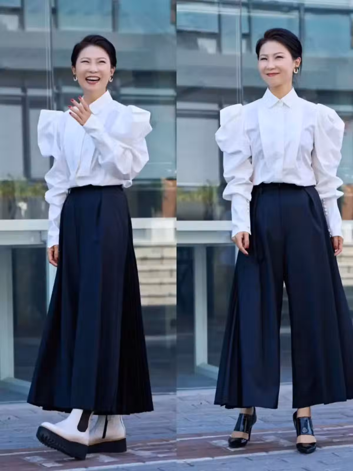 提到最經典大氣的配色思路,黑白配絕對有姓名。穿黑色闊腿長褲時,中老年人不妨組合白色上衣,塑造經典大氣又不沉悶的形象。