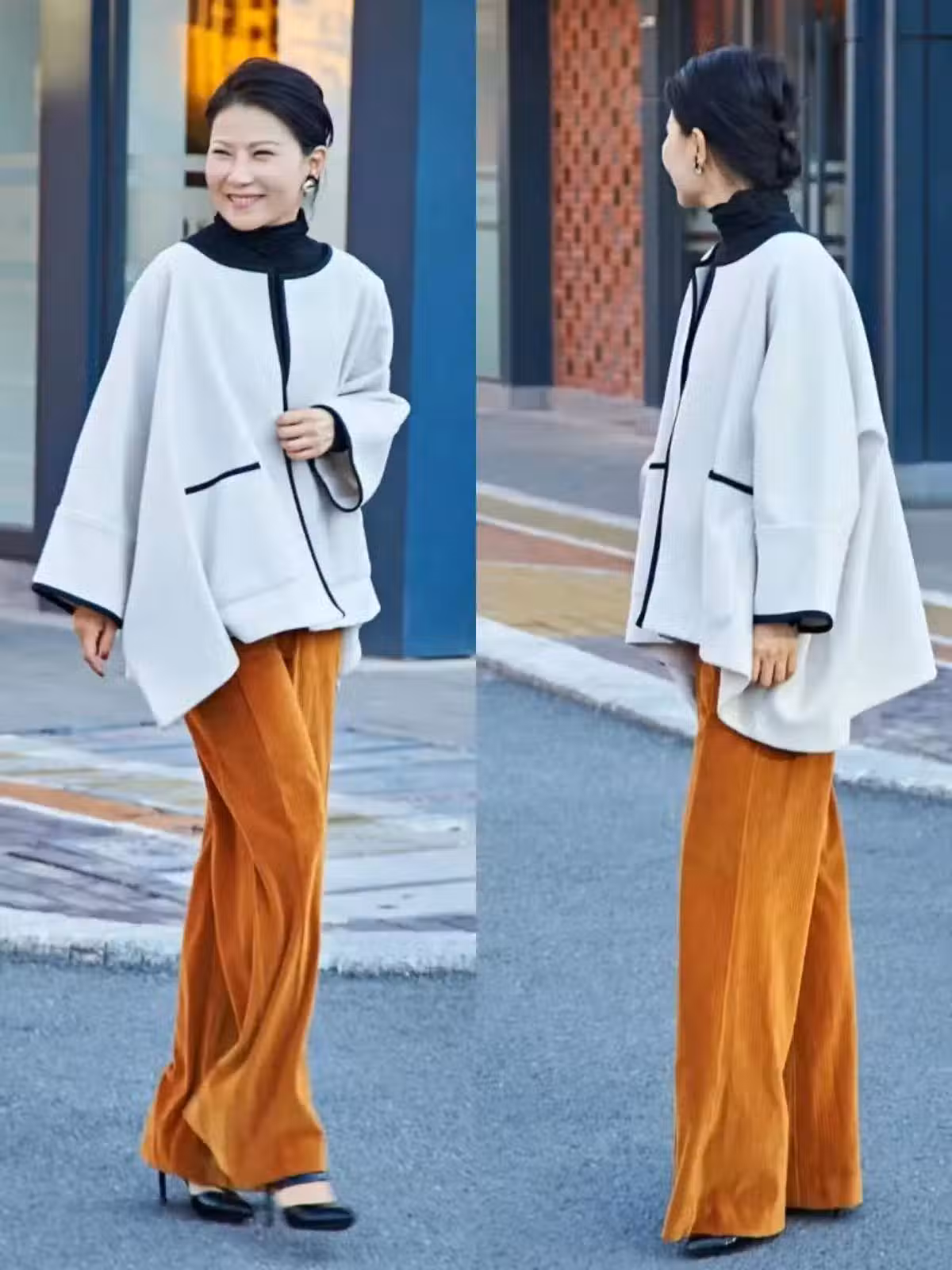 大地色系絕對是最具秋季氛圍的高級色,除了選擇大地色系闊腿西褲,女人年紀大了還可以將金棕色或者金駝色系燈芯絨闊腿長褲安排上。