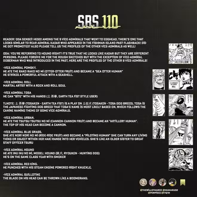 尾田:你指的是「獵犬」吧?確實他看起來和「卡達爾」相似,但他們是不同的人物。請原諒我的簡筆,除了之前介紹過的道伯曼中將,以下是其他8位中將的簡介!