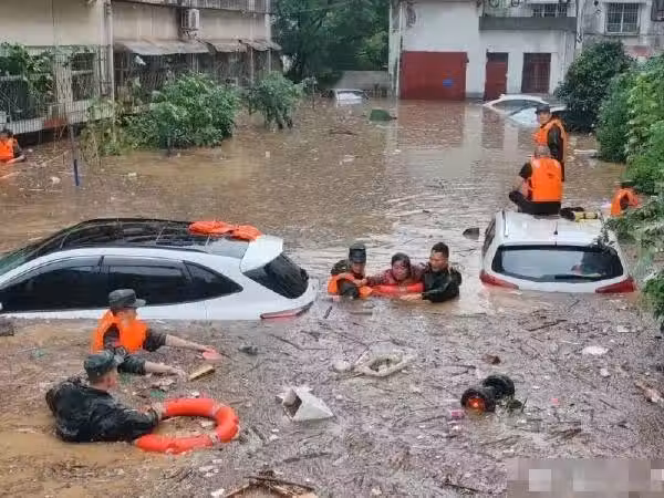 寶雞市近日降下破紀錄雨量, 市區多輛汽車被洪水沖走,地下車庫出現雨水倒灌現象,多個地勢較低的居民區和商店均被淹。