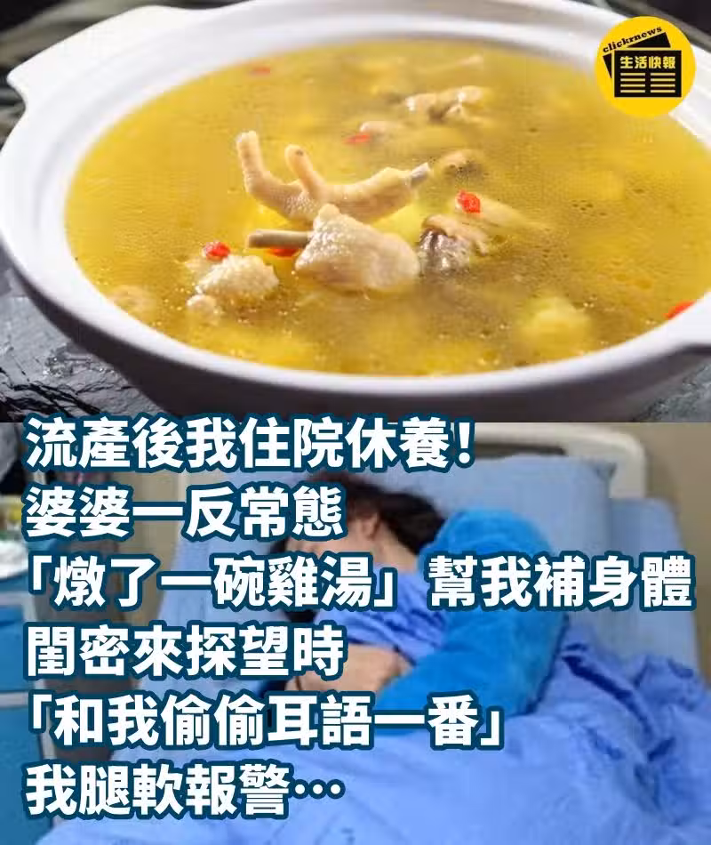 流產後我住院休養! 婆婆一反常態「燉了一碗雞湯」幫我補身體,閨密來探望時「和我偷偷耳語一番」我腿軟報警~