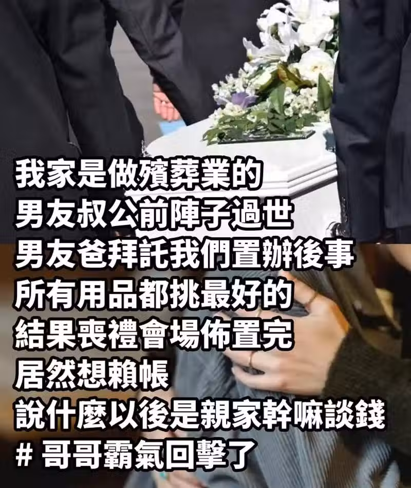 我家是做殯葬業的,男友叔公前陣子過世,男友爸拜託我們置辦後事,所有用品都挑最好的,結果喪禮會場布置完,居然想賴帳,說什麼以後是親家、幹嘛談錢 # 哥哥霸氣回擊了