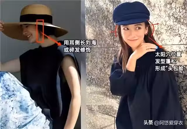帽子與髮型的搭配是展現個人風格的關鍵,千萬別隨便將頭髮紮起來或者別在耳朵後面,如果臉部留白多,我們可以利用髮絲的自然垂落或捲曲有效修飾臉型,用兩側的碎發遮擋臉頰,使臉部線條更加柔和。