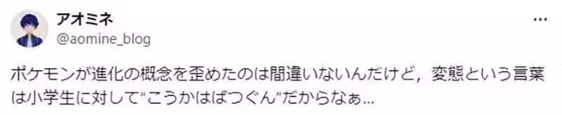 「與其說是『進化』這個詞彙被《寶可夢》扭曲了,不如說是『變態』這個詞彙被社會大眾扭曲了吧。想想生物老師上課的時候,一講到這個詞彙全班都會爆笑,你就知道有多麼不正常了。」