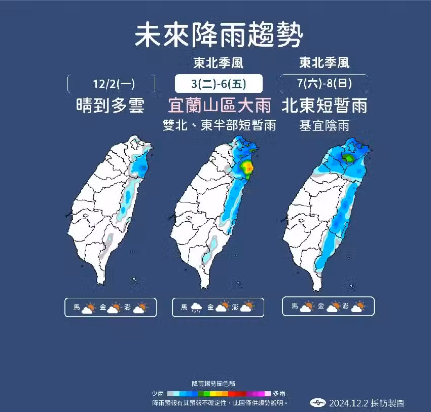 他指出,雖然這波東北季風帶來的涼意有限,但水汽充沛,北部及東半部地區將轉為多雨天氣。