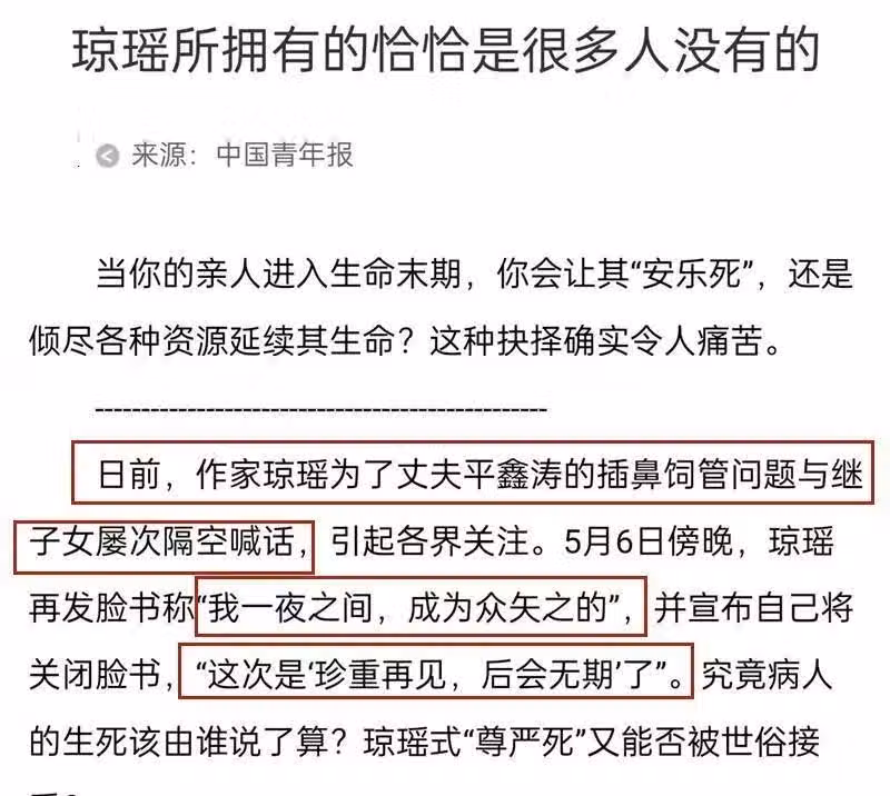 同年丈夫平鑫濤重病時,她也曾因為有意讓其可以「尊嚴死」,與繼子繼女間發生過一場拉鋸式的「口水戰」。