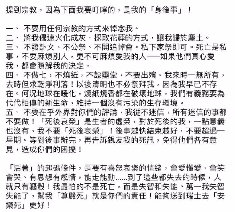 不在意外界評論:她告誡家人不必理會外界的評論,只需堅持按照她的遺願行事。