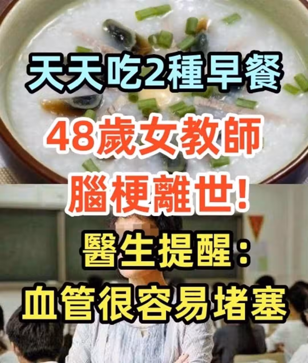 48歲女教師腦梗離世,醫生:天天吃2種早餐,血管很容易堵塞!!