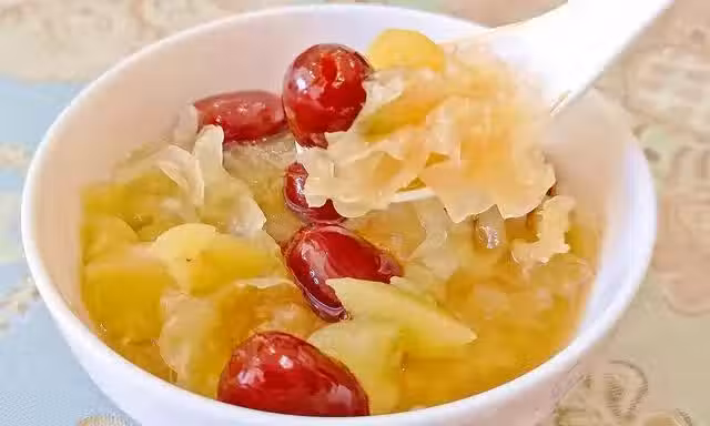 這款蘋果雪梨銀耳紅棗羹不僅美味可口,還富含營養,特別適合在寒冷的天氣里暖胃和潤喉。蘋果和雪梨的甜美,銀耳的滋補,紅棗的補血功效,使這道羹成為一道健康的甜品選擇。