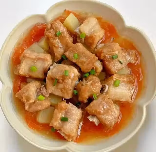 2把番茄去皮切片,土豆去皮切塊,放入蒸碗中,再鋪上腌制好的排骨3水開上汽後上鍋,大火蒸30~40分鐘,再撒上蔥花即可