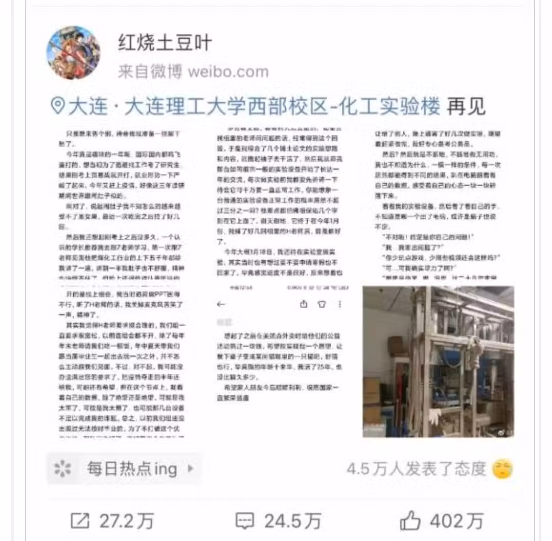 遺書里,他寫了一些不快樂的瑣事「今年真是糟糕的一年呢……想當初為了逃避找工作考了研究生,結果剛考上貿易戰就開打。就業形勢更嚴峻了。我聽老師的話,多去看文獻,然後擼起袖子去幹活,和如同祖宗一般的實驗設備開始了長達一年的交流……可最後,老師說我的數據沒有意義。過去一年多做的一切推翻重來。」、「夏天拼了命趕進度,白天把設備讓給別人,晚上通宵做實驗。然後就不斷地不斷地做無用功,一模一樣的條件,每一次居然都能得到不一樣的結果,心態崩潰了。」。