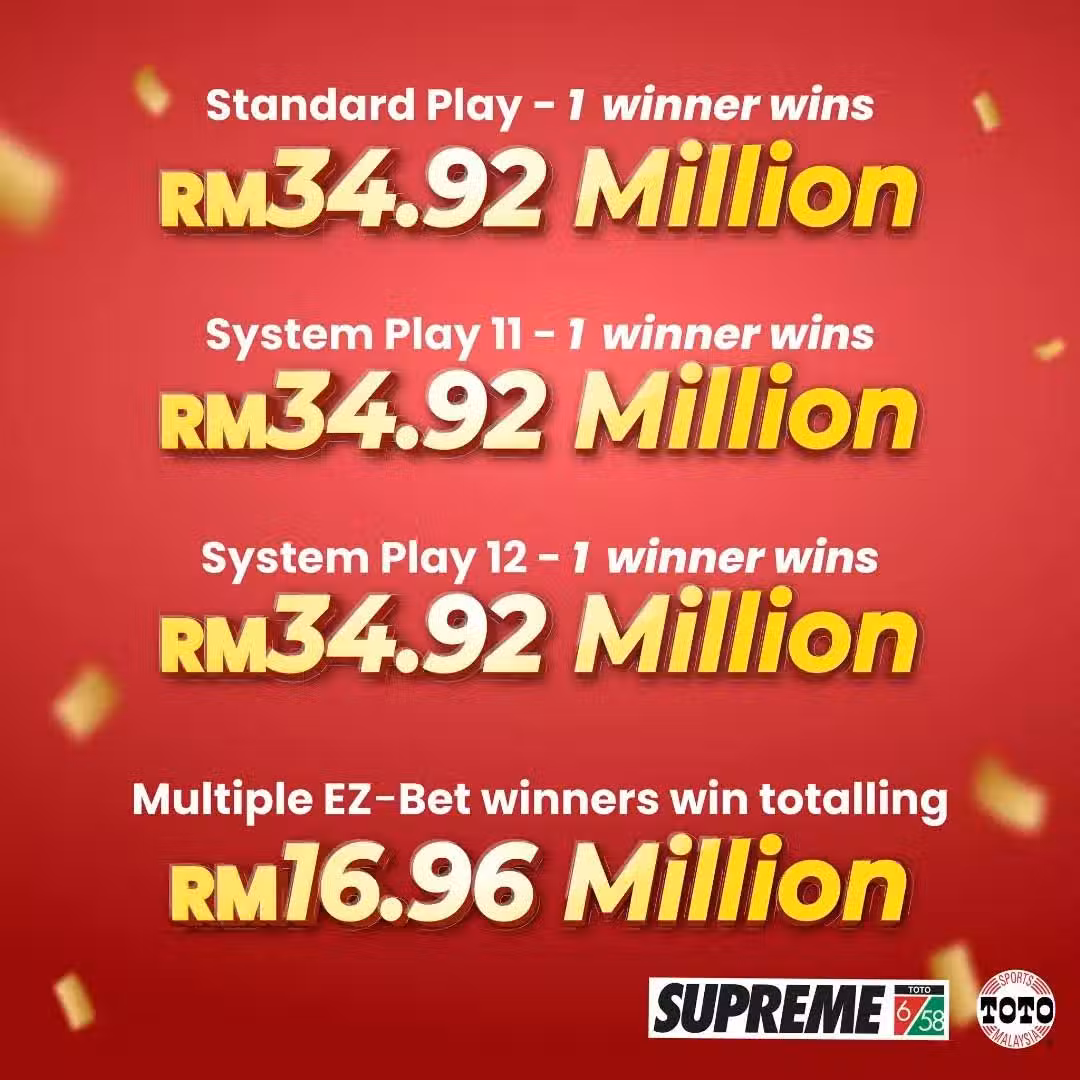 1名標準玩法贏家贏得3492萬令吉, 2名系統玩法贏家(分別投注System11和12),每人分別贏得3492萬令吉,還有多名ez-bet贏家共享1696萬令吉,可確定至少5名幸運兒共享逾1億2000萬令吉!