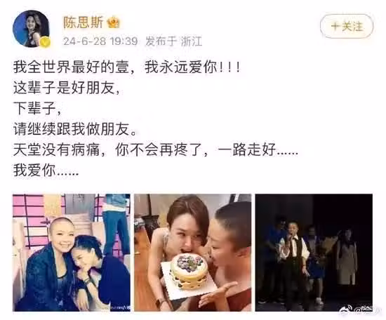 她配文寫下「我全世界最好的壹,我永遠愛你!!!這輩子是好朋友,下輩子,請繼續跟我做朋友。天堂沒有病痛,你不會再疼了,一路走好……我愛你…… 」。