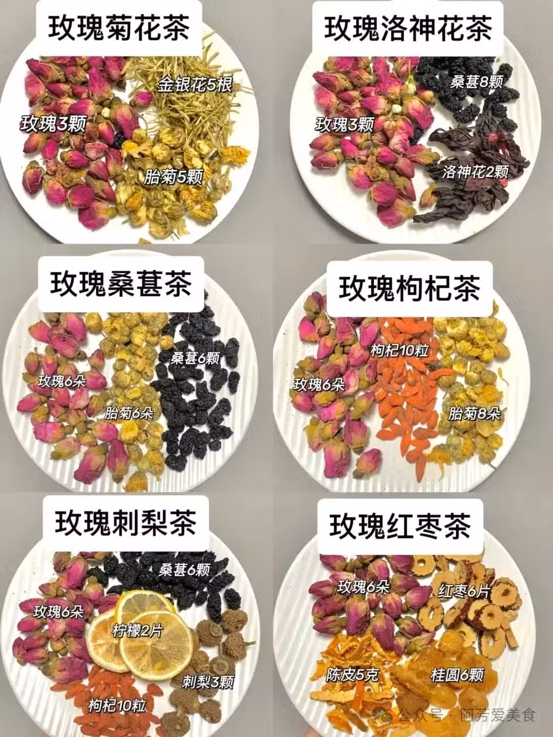 玫瑰菊花茶非常的清爽,玫瑰的花香搭配菊花清爽的口感,喝上一口感覺身體都清爽了不少。玫瑰紅棗茶則是帶一絲甜甜的,加入了陳皮和桂圓,口感更豐富。