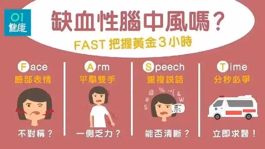 還有一種「小中風」,症狀會持續幾分鐘或幾十分鐘,最多不超過 24小時,不會留下任何後遺症,多數患者患病的時候意識清楚。