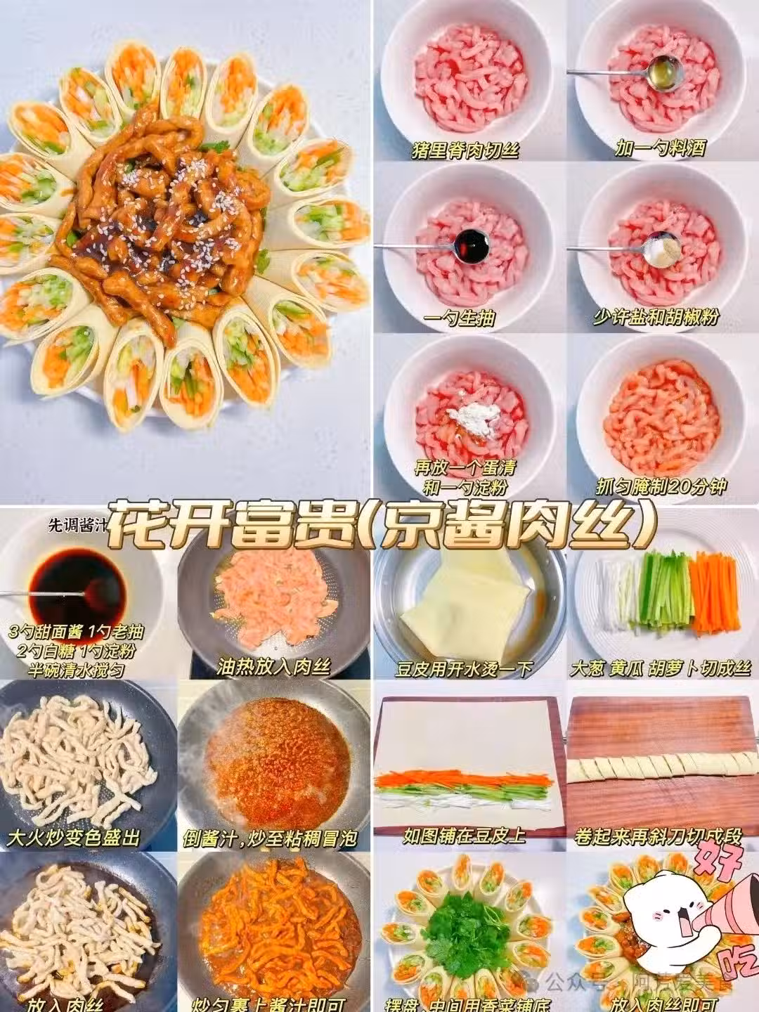 京醬肉絲的寓意是花開富貴,這道菜非常的好吃,肉絲再切成細條狀後,再調好醬汁,淋上去非常的香,再用豆皮包裹裝飾一下,不僅好看又好吃。